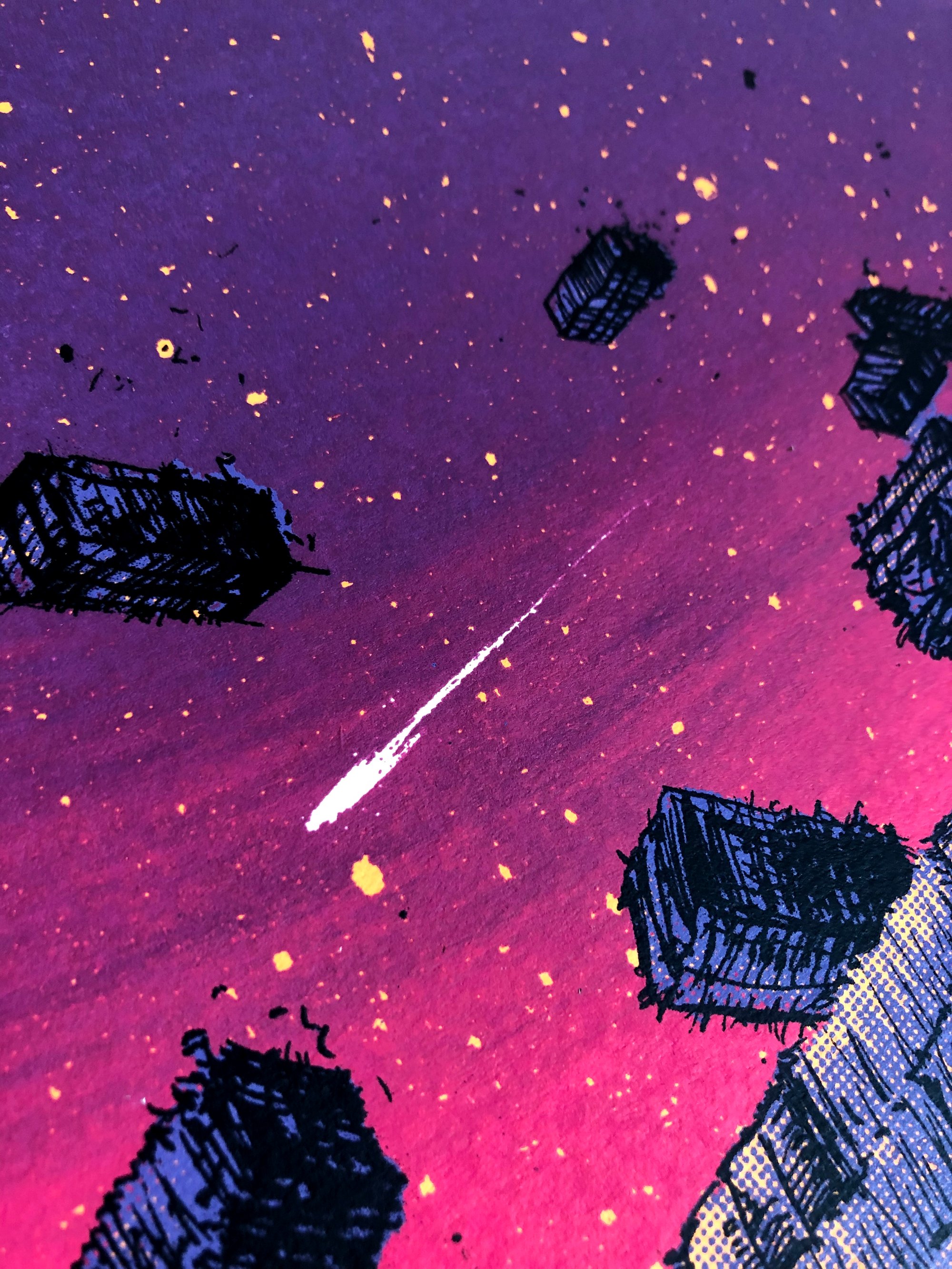 Each with a one 3 color split-fountain in the sky so each print is unique in its swirly sky