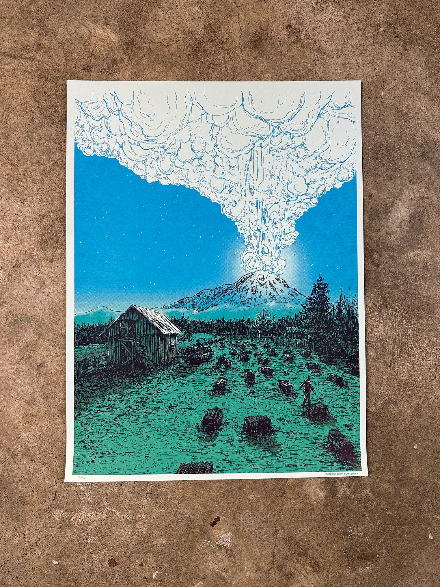 3 color hand pulled screen print with split fountains (natural gradient of ink blended on the paper)