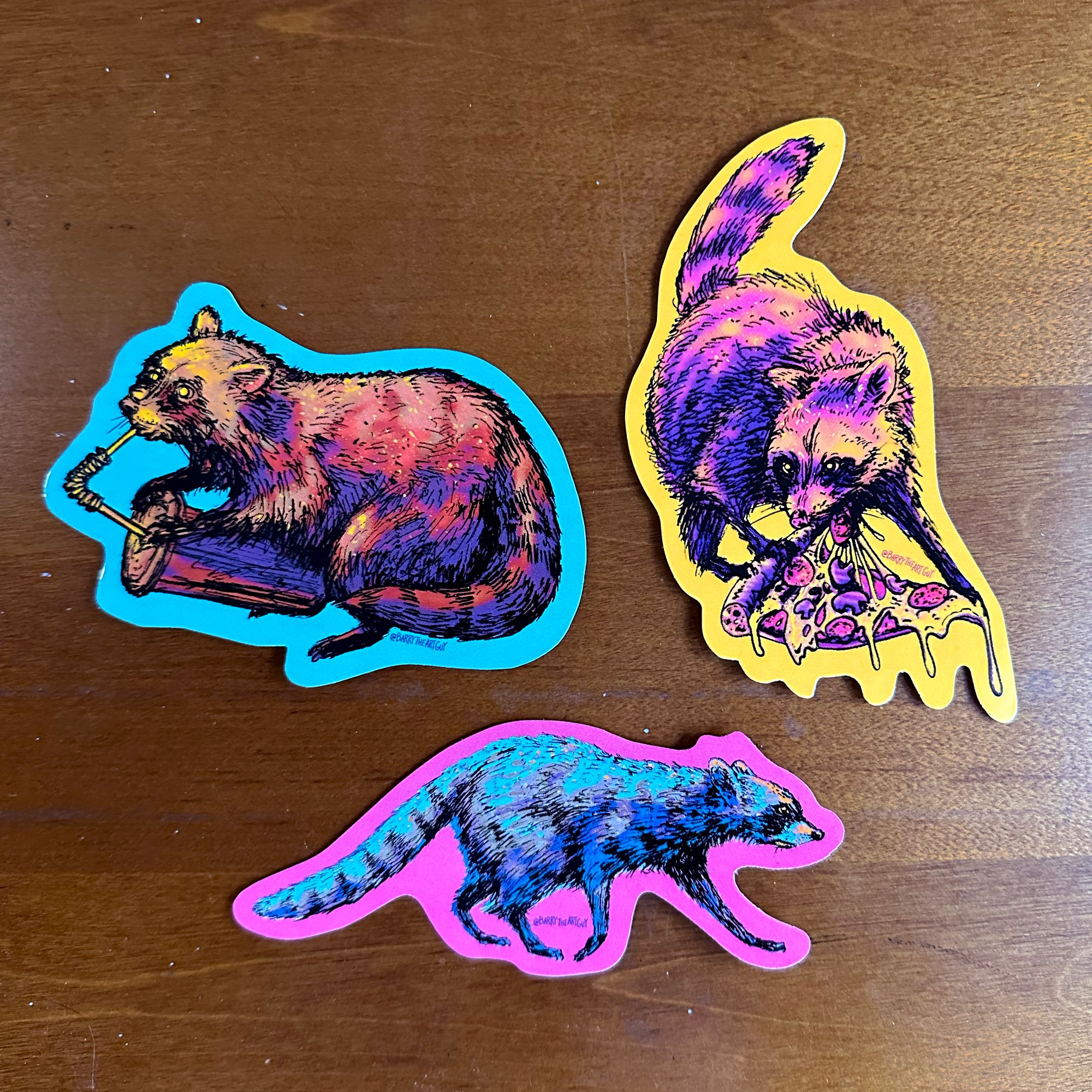 Die cut Trash Panda Sticker Pack 3 raccoons one walking one eating pizza one drinking soda